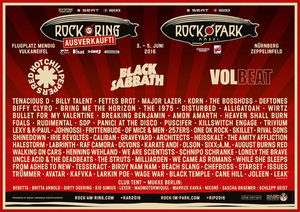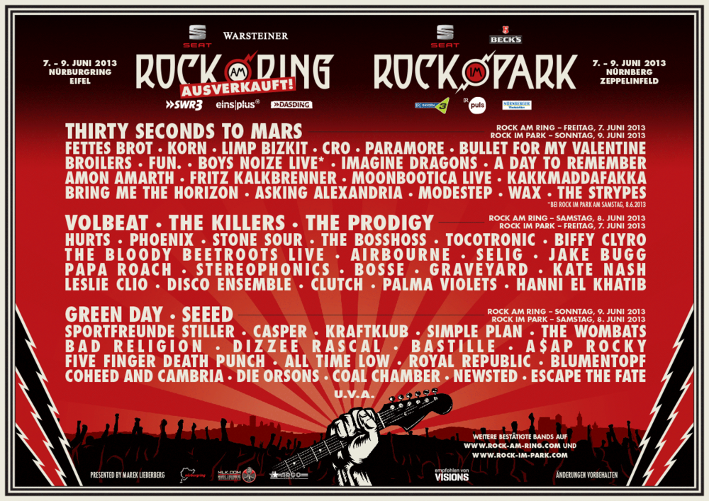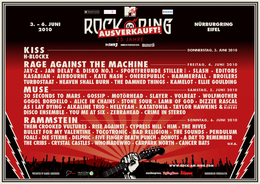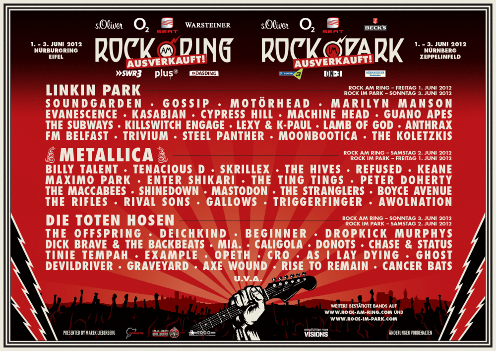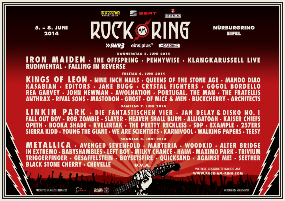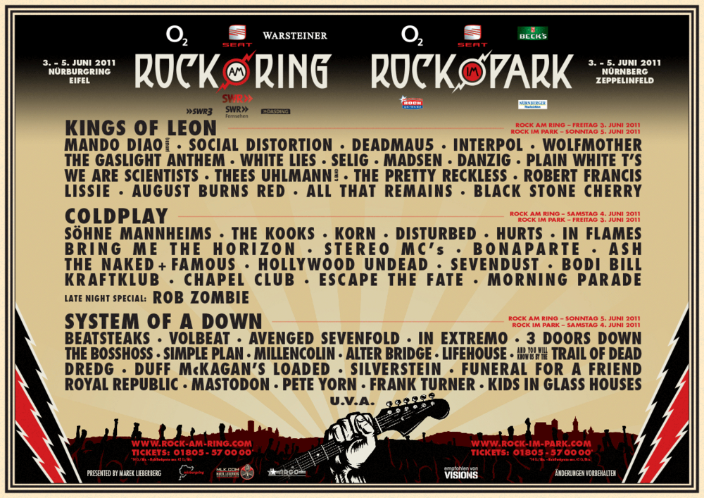 Kings Of Leon, Coldplay, System of a Down, mando Diao, Social Distortiion, Deadmau5, Interpol, Wolfmother, The Gaslight Anthem, Madsen, Söhne Mannheims, The Kooks, KoRn, Disturbed, Hurts, In Flames, Stereo MC’s, Beatsteaks, Volbeat, Avenged Sevenfold, In Extremo, Millencolin