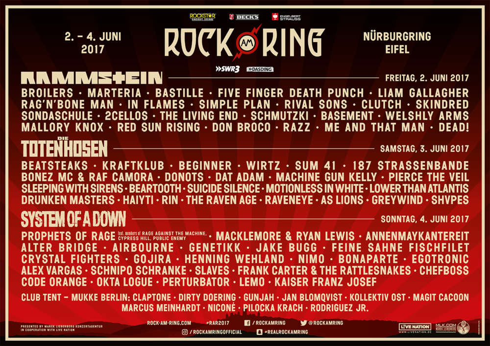 System of a Down, Die Tote Hosen, Broilers, Marteria, In Flames, Rag’n’Boneman, 2 Cellos, Beatsteaks, Kraftklub, Beginner, Sum 41, Prophets of Rage, Macklemore & Ryan Lewis, Annnenmaykantereit, Airbourne, Genetik