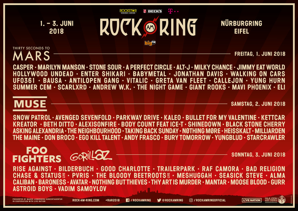 30 Seconds to Mars, Muse, Foo Fighters, Casper, Marilyn Manson, Stone Sour, Alt-J, Jimmy Eat World, Snow Patrol, Avenged Sevenfold, Parkway Drive, beth Dito, Shinedown, Rise Against, Bilderbuch, Good Charlotte, Bad Religion