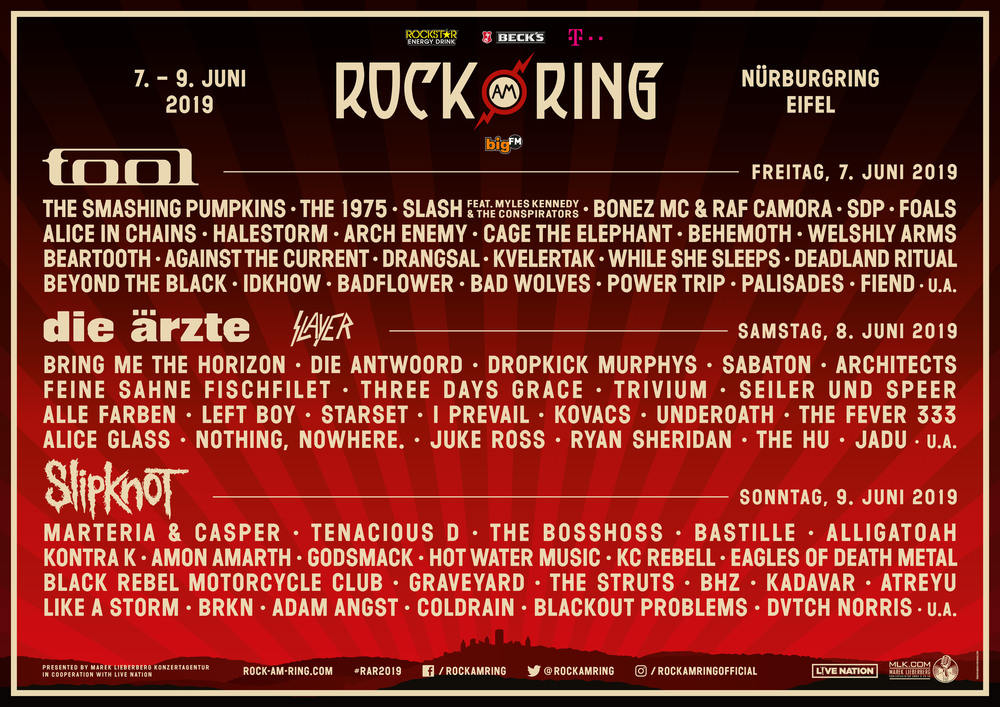 Slipknot, Die Ärzte, Marteria & Casper, The Smashing Pumpkins, Slash, Bonez MC & Raf Camora, Alice in Chains, Drangsal, Bring Me The Horizon, Die Antwoord, Dropkick Murphys, Sabaton, Feine Sahne Fischfilet, Tenacious D, Kontra K
